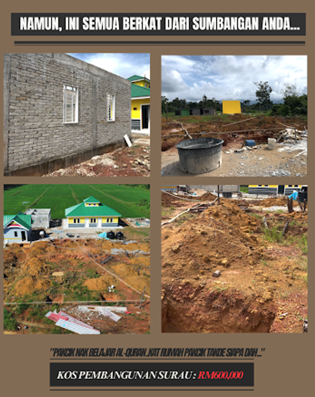 Anda infaq, kami salurkan kepada pembangunan surau warga emas ini. RM600,000 perlu dikumpul, untuk menghentikan penantian warga emas yang kesunyian di rumah tanpa pengisian agama. Selagi surau ini tidak siap, kami tidak boleh memulakan pengajian!