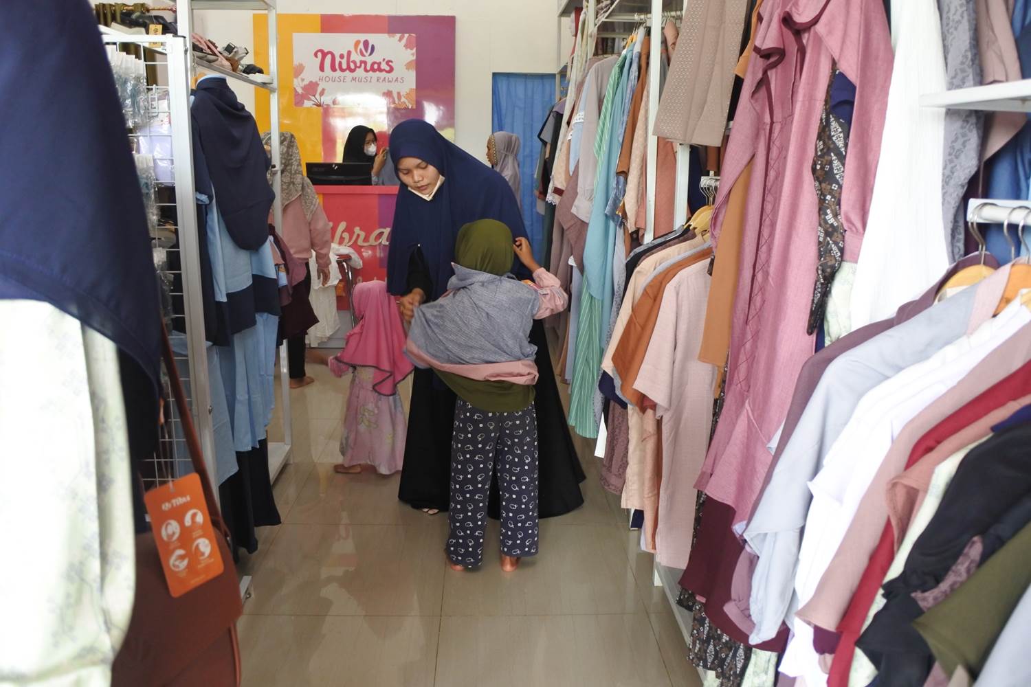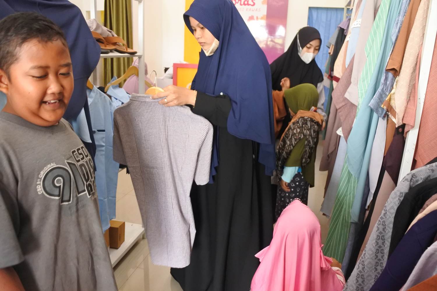 Gambar 1.4 Dibantu oleh pegawai kedai dan pihak LPQ Al Huda dalam memilih pakaian yang adik-adik ini suka