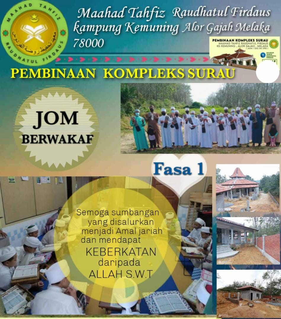 Sempena bulan Rabiulakhir,bulan yang mulia ini, kami merayu kepada masyarakat islam untuk menyumbang bagi menjayakan Pembinaan Surau Maahad Tahfiz Raudhatul Firdaus.. Kini kami masih memerlukan kos sebanyak RM 43,718.Anggaran keseluruhan kos pembinaan adalah sebanyak RM 350,000.. Kutipan yang berjaya dikumpulkan setakat ini adalah RM 306,282.. Buat masa ini 75 peratus daripada pembinaan Surau ini telah berjaya disiapkan..
